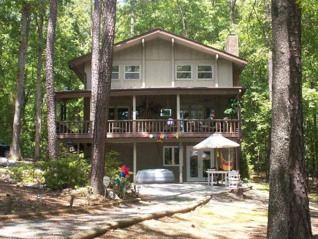 Easy lake living! Ceramic tile, berber carpet, natural wooded lot, not much yard work. This lovely home was updated in 2000 with new flooring, appliances, paint, and carpet. A must see! Nice rustic 2 story, 3 bedroom, 2 bath lake home with old fashioned covered porch, recreation room, and workshop. Bulkheaded waterfront lot is level, wooded and private. Single boathouse and dock. Beautiful wide cove view off main lake, deep water, convenient area, alarm system, handi-cap ramps to house, and handi-cap chair to upstairs. New heat pump & hot water heater installed in 2009. Can be purchased fully furnished. Bring your toothbrush and enjoy the beautiful cove to main lake view!