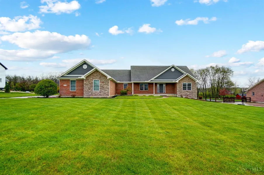 Exceptional Ranch on 1.36 acre, tree-lined lot with approx. 4000 sq ft of living space (pchr)! Featuring: Open concept w/gleaming hardwood floors! Spacious owner's suite with vaulted ceiling & deluxe bathroom w/2 separate vanities, 3 closets, separate shower & jetted tub! Split bedrooms w/jack-n-jill bath! 1st floor powder room & laundry, oversized 3 car garage, covered front porch and back porch w/canned lighting and fan! Fresh paint, new carpet in bedrooms, finished lower level with 64 ft rec room, bar area, full bath, 15x15 bonus room & multiple storage areas. Move-in ready! Well maintained.