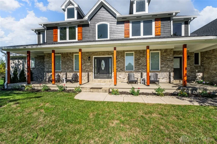 Nestled on 2.84 acres of beautifully landscaped grounds, this stunning residence features a stylish covered front porch, and a newly installed vintage-style front door. Step into an elegant foyer that showcases peek-a-boo views of the backyard. The expansive, two-story great room embodies luxury and sophistication. A floor-to-ceiling modern electric fireplace with a custom mantle adds warmth, while arched windows flood the space with natural light and the dining room features a modern woodworking accent wall and a custom farmhouse chandelier. The chef's kitchen is a dream with quartz countertops, ample storage, and a sleek touch-screen refrigerator. The dining island and cozy breakfast nook, framed by a bay window, offers the perfect space to entertain. The main floor primary bedroom boasts private deck access, a walk-in closet, and a spa-like bathroom with a soaking tub. Outside, enjoy ...