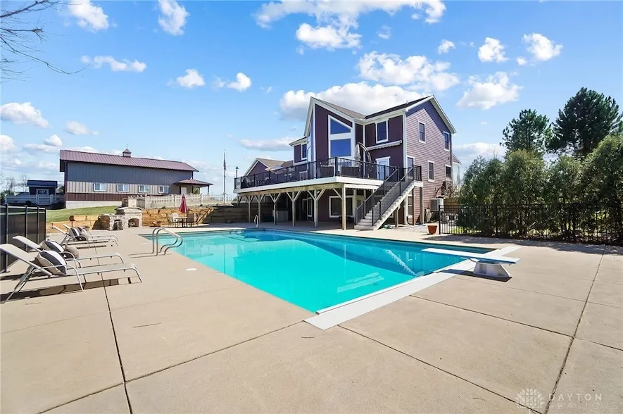This stunning 5-bedroom, 4.5-bathroom home in Waynesville sits on nearly 3 acres, offering a perfect blend of luxury and functionality in a serene country setting within a neighborhood. Spanning approximately 4,600 sq. ft., including the finished walkout basement, the home features slate flooring, solid hickory doors, Andersen windows, and a whole-house generator. The gourmet kitchen boasts a gas stove, convection oven, built-in microwave, pantry, and butler s pantry. The main level includes a master suite, while upstairs offers a second master with an en-suite bath, a huge loft, two additional bedrooms, and a full bathroom with granite finishes. The finished basement provides 9-foot ceilings, a full kitchen with an electric stove and refrigerator, a separate in-law suite with its own washer and dryer, a game room, storage, and an exercise room. Outside, the 1,100 sq. ft. composite deck overlooks a 25x40 saltwater pool with a diving board, an automatic cover, a deep end of 9 feet, and Buckeye concrete construction with no liner. The exterior of the home, clad in Hardy plank, was painted in September 2021. A standout feature of this property is the two massive outbuildings a 42x80 back barn built in 2017 with full electric, a working cupola fan, a garage door opener, and a Walters Building construction, and a finished 36x48 front barn built in 2013 featuring 25-foot ceilings, epoxy flooring, a car lift, a 220 sub-panel, plumbed for a bathroom. Additional features include PEX plumbing with a manifold system, a water softener, two 1,000-gallon underground propane tanks, a newer furnace installed in October 2023, and new pool equipment, including a sand filter and pump. This exceptional home is a rare find in Warren County, offering unmatched space, amenities, and craftsmanship schedule your showing today! Concrete floor is 6" thick and 4000 psi and rebar enforced. Chicken run with coop and is ready for chickens (Taj Mahal for chickens!)