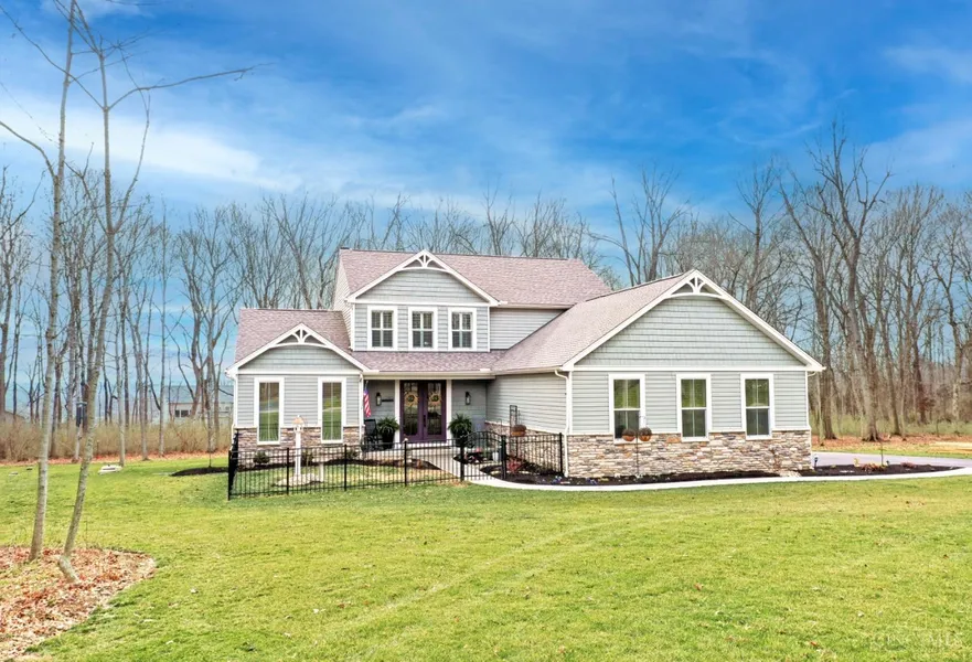 Nestled in a secluded private lane neighborhood just minutes from downtown Lebanon, this stunning 3-bedroom, 4-bath home offers luxury living on 2 acres of serene wooded property. Newly built in 2022, this residence boasts 2,565 SF above grade plus a partially finished basement w/ a rec room, half bath & ample storage. A fenced courtyard welcomes you to a grand double-door entry, leading into the breathtaking 2-story great room with 20-foot stone and shiplap fireplace. The gourmet kitchen features an oversized island, porcelain farmhouse sink, pot filler, wine fridge & custom lighting. The main-level primary suite offers a spa-like retreat with a luxury bath and rainhead shower, while two additional bedrooms, a full guest bath, & a loft await upstairs.Thoughtfully designed, this home includes soundproofing, LVP flooring, oversized windows w/ custom treatments & an insulated workshop garage. Plumbed for a generator & gas grill. Picturesque views complete this exceptional property!