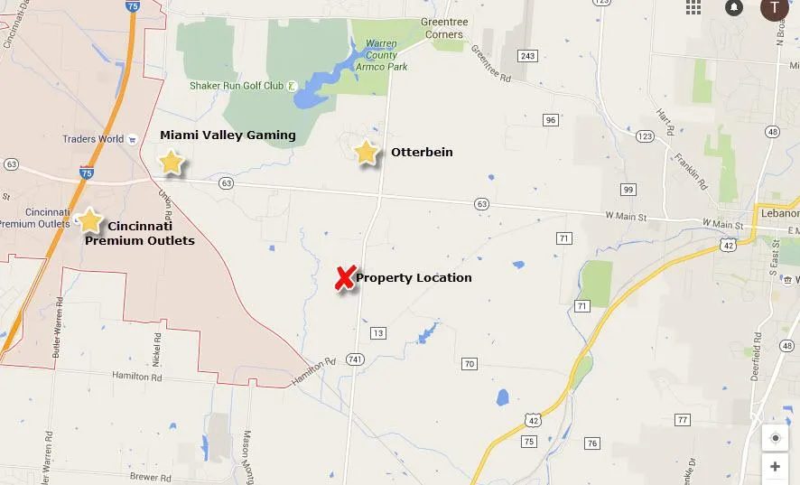 40ac of Prime development opportunity located just South of 63 & 741 crossroads. Two miles East of I-75, minutes from Otterbein, Miami Valley Gaming, & Cincinnati Premium Outlets. Water, electric, gas available. Approx. 1000' from public sewer located at ODOT Building. Zoned Mixed Use-Neighborhood. Survey in progress, final acreage subject to.