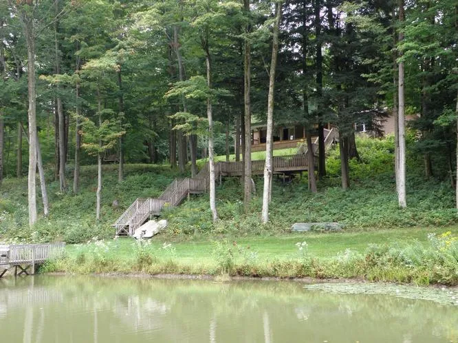 This is the place to watch the deer, turkey and black bears roam and the bald eagles soar! Absolutely beautiful piece of property! Secluded setting with over 124 acres, located on a no outlet road, with excellent hunting and fishing or just complete quiet enjoyment! The home could be used as a camp or a year around home with a newer propane furnace and a gorgeous stone wood burning fireplace. The master bedroom suite faces the water and comes with all the extras, even a jetted tub. Custom oak kitchen with all appliances, island and view of the pond too! Laundry room with stackable washer and dryer, sink and door to the great outdoors. Enjoy the 40' x 12' covered deck overlooking a wonderful 1 1/2 acre pond stocked with blue gills, bass, big catfish as well large perch, bass, koi, Israeli algae eaters or walk down the steps and sit on the dock! Pond has 2 aerators to keep the water sparkling! 7 custom deer blinds can be found in the woods. Newer roof, hot water tank & home is well insulated. An alarm system is in place. A new 14' x 20' two story storage building, plus a huge two story garage with electric and heat, which offers a full upstairs for either a "bunk room" for your hunter friends or a workshop area for you! Most furnishings will remain with the property as an added bonus. Call today...this is a tremendous value for this fantastic property with some timber value too!