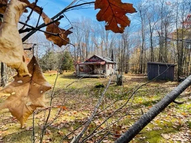 Step aside! This hideaway is the ideal retreat because it is tucked away and surrounded by trees. This quaint cabin features a wood burner for heating and a newer pine constructed outhouse, which is part of the shed. There is a refrigerator, a propane-heated stove for cooking, and the furniture is still there. It has a more recent roof and a front porch where you may enjoy the spring peepers. It has a kitchen/dining area and two additional rooms currently used as a bedroom and livingroom. They could be two bedrooms. The property is completed by a circular driveway, a fire pit, and a shed measuring 10x20 feet.#snowmobiling #fourwheeling #land #hunting #camping #retreat #country