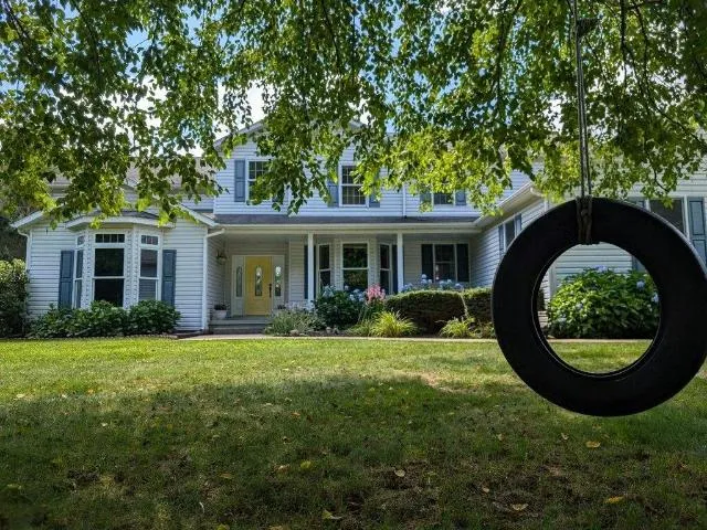 This large contemporary home is light and bright and has plenty of amenities. It features a cozy two-sided fireplace nestled between the kitchen and great room. The huge eat-in kitchen has a built-in office space, large island, beautiful hardwood floors and ample work space. The great room has an awe inspiring two-storied ceiling and is accented with the fire place that sweeps all the way to the peak. The balcony area overlooks first floor living space. There's also a first floor master suite with his and hers walk-in closets, large shower and a jetted garden tub. Each bedroom upstairs has its own bathroom. The well landscaped yard has fruit trees, perennials and flowering bushes. The covered porch has Trex decking and is perfect for entertaining. Plus this home sits on 1.89 acres! The basement is newly finished for an amazing added living space including a full kitchen, two possible bed...