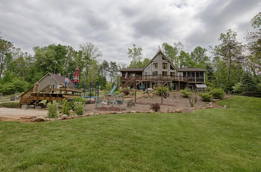 Looking for privacy? Open and airy chalet nestled on 11+ acres with seasonal views. A wonderful blend of indoor and outdoor spaces make this home perfect for entertaining or simply enjoying the beauty of mother nature. Gourmet kitchen with granite, stainless steel appliances and pantry. Main level master bedroom with walk-in closet and luxury bath. Upper level loft is perfect studio, reading or TV/game room. Fully finished lower level with rec room and 2nd master bedroom with full bath. Built-in 2-car garage on lower level plus detached 2-car garage with upper level storage space or finish for additional living space. 11+ acres with the potential to build a 2nd dwelling.