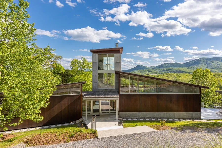 Atop the Shenandoah Valley overlooking Massanutten Mountain and the North Fork of the Shenandoah River, this breathtaking modern home is a fine representation of architect Jim Burton's internationally celebrated work. The main home is built of insulated concrete with steel framing, a butterfly roof, and the amazing 40ft tower with some of the best views you'll ever find in our region. The rich amenities add to the getaway, with a standalone modern guest house enjoying a private pond, outdoor living spaces, even an outdoor sauna and spa. Meander across the fields to the rivers edge for picnics, swimming, bocce, archery, canoes and kayaks, or throw a summer party. It is an incredible home, on an awe inspiring site.