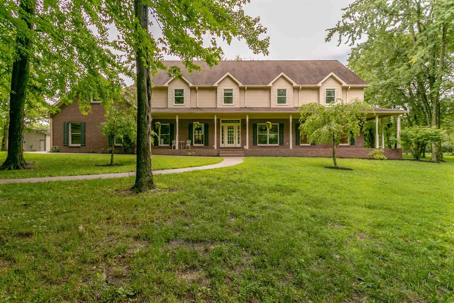 Custom built home nestled away in Paradise Lakes surrounded by 9 acres of mature trees and landscaping. Though the house is in an exclusive upscale development this house has the setting of being in the country with abundant wildlife and all the privacy one can hope for. This home has an open entertaining floor plan, with ceilings soaring to 18 feet. Extensive custom hardwood (7 wide) and limestone tile flooring. Nine foot windowed walls and 4 skylights, gives the feeling of being outdoors at all times, from rising sun to moonlit starry nights. Kitchen island/bar with custom dual stainless steel sink and brushed nickel faucet. The open floor plan insures the kitchen chef/cook will be part of the large gatherings with family and friends. Great room wired for surround sound system, perfect for in home movies or listening to music. Cozy up to the fireplace, where a natural gas log fireplace provides the warmth of hearth and home. Master suite has panoramic views and 18 foot ceilings, his and her walk in closets, corner whirlpool tub, separate tub/shower, double limestone vanity, bidet, and French doors to the outside. Lighted hardwood staircase leads to the upstairs, with an open balcony looking over the great room, dining and kitchen. Three bedrooms upstairs, Jack & Jill bath with an additional full bath. There is also walk-in attic storage. Large main floor laundry room has custom cabinets, laundry chute, beautiful tile floor and stow away ironing board. Wrap around porches and a lighted 16 x 65 deck off of great room. Three car attached garage with an 8 foot height on the third bay. Full unfinished basement with stairwell exit is roughed in for a bath and ready to be finished. There is also a 30 x 40 insulated pole barn. Fully stocked 1.5 acre private lake with water about 20 feet at the deepest part provides family fun for boating, fishing and swimming, and a private respite with a relaxing view of the water.