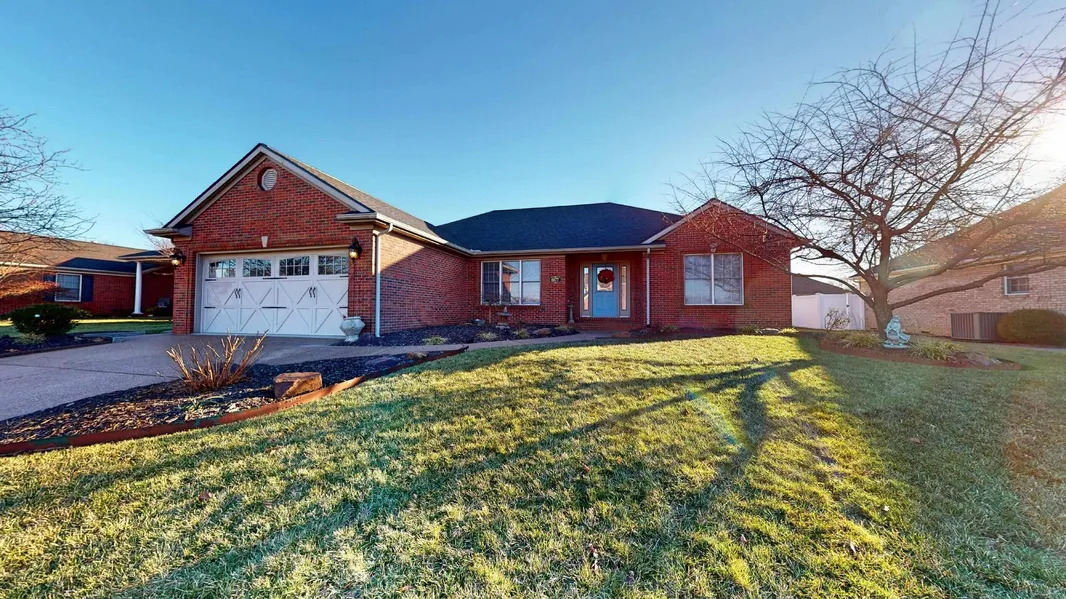 Looking for that one with the feeling of home? This delightful all brick ranch in Oak Grove subdivision will excite you upon arrival - from the highly desirable neighborhood and beautiful curb appeal to the interior's tidiness and improvements. Noteworthy updates include a brand new roof (Nov 2021), newer HVAC system (3 yrs old), newer stainless steel appliances (2-3 yrs old), tankless water heater (5 yrs old). The attached 2 car garage features a decorative carriage style door with windows and a floor you could eat off of with new floor coating and freshly painted walls/ceiling. Split bedroom design in this wonderful layout featuring a cathedral ceiling great room with gas log fireplace, spacious tiled foyer entry, and formal dining room or potential to be an office for the person working from home. Many windows for that natural light we all crave. Great looking kitchen with white cabin...