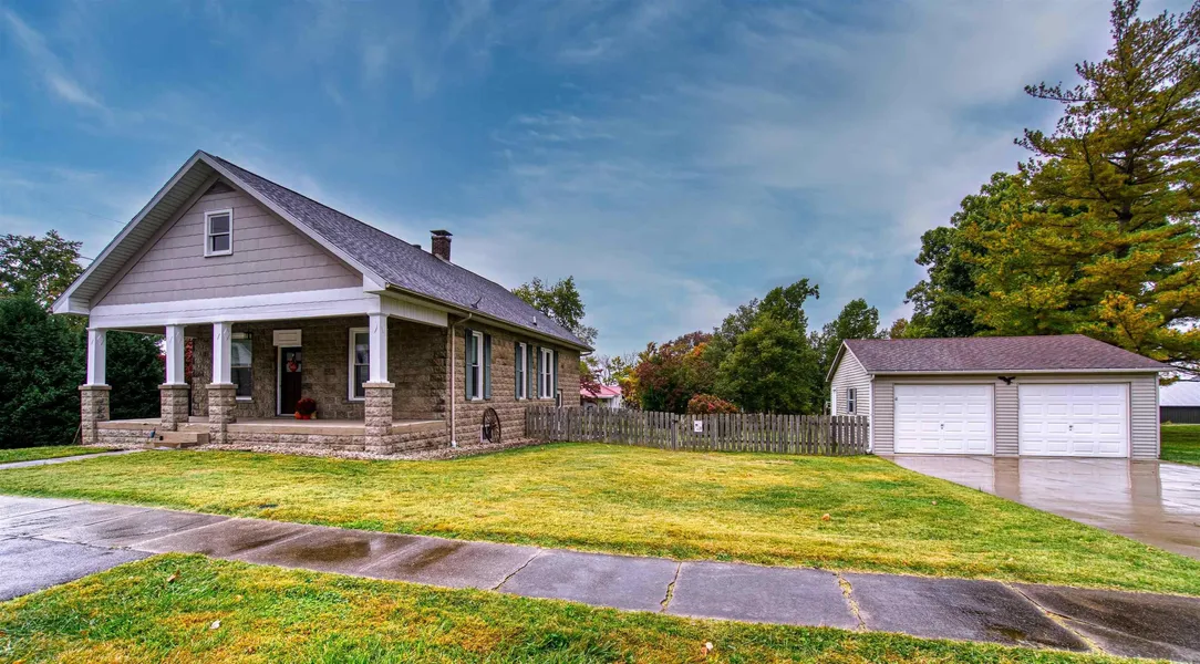 This well maintained and updated home with three bedrooms and two full baths is in the heart of Elberfeld. It is situated on a large lot with a detached two and a half car garage. This home offers great curb appeal starting with the front porch perfect for relaxing. The spacious living room has many large windows to allow for natural light. There are two main level bedrooms, one with an updated en suite full bath and has beautiful sliding barn doors and a nice sun room that allows you to look over the spacious back yard. The second bedroom off of the living room has access to the second hall full bath. The eat in kitchen offers updated cabinetry, countertops and appliances. The second level offers a third bedroom and walk in storage that could be finished for additional living space if desired. The home also offers a large unfinished basement that is great for additional storage and laundry. The oversized lot is fenced in and has a large wooden deck off the back of the home perfect for entertaining.