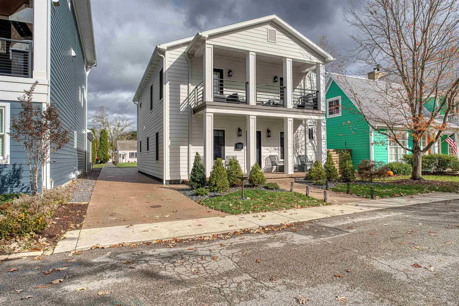 Newer construction with a stunning view of the Ohio River! This 2,906 sq ft home offers a thoughtfully designed layout. The main floor features an open-concept living area that seamlessly flows from the living room to the kitchen and dining space. You'll find one bedroom on this level, along with a full guest bathroom and a convenient laundry room. The kitchen boasts custom Amish cabinetry with soft-close drawers, a stylish backsplash, quartz countertops, a breakfast bar island, and top-tier stainless steel LG appliances. Adjacent to the kitchen, the laundry room includes a sink, extra storage closet, and additional cabinetry. The main floor is finished with engineered hardwood flooring and high ceilings. Upstairs, the spacious owner's suite includes access to a private balcony with composite decking (21'x6') and beautiful river views. The suite also features a luxurious bathroom with dual vanities, a large custom-tiled shower, and a walk-in closet (13'x7'). An additional bedroom also has balcony access with river views. The upper hallway includes a wet bar with a counter, mini fridge, and shelving, perfect for entertaining. The shared hallway bathroom has a unique design, with vanities at each end and a central shower/toilet area. At the end of the hall is a versatile, oversized bedroom that can also serve as a bonus room. The exterior siding is high-quality "Select," approved by the local historic district. The garage includes a side service door, a remote opener, and crawlspace access with a conditioned space, concrete floor, and dehumidifier. Outdoor features include an exposed aggregate driveway and sidewalk, and a cozy covered front porch ideal for relaxing. All of this is just moments away from Newburgh's charming shops and dining spots! Exclude the Wood Guitar Wall holder upstairs and Shelf above piano.