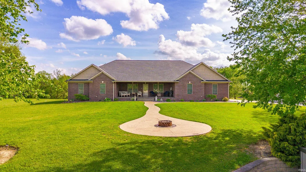 This stunning ranch home offers over 5 acres of scenic land with beautiful water views, a finished walkout basement for versatile living space, a detached garage for convenience, and additional features that make it a true slice of heaven. Ideally situated near Alcoa, Friedman Park, Newburgh, and numerous other attractions, this home offers convenience as well as comfort. Arriving along the long driveway, the home's setting welcomes you with a picturesque lake and lush greenery, creating a serene and inviting atmosphere. Entering through the oversized, covered front porch, the living room greets you with soaring ceilings, a cozy gas fireplace, and built-in bookshelves. Overlooking the living area, the kitchen features Amish cabinetry, granite countertops, a large island with bar seating, a walk-in pantry, and sleek stainless steel appliances, while the adjacent dining area provides easy access to the open deck. Down the hall, three of the four bedrooms are located, including the expansive owner's suite, which features a walk-in closet with built-ins and an ensuite bathroom equipped with a freestanding bathtub, a tiled walk-in shower, and a twin sink vanity. The remaining main-floor bedrooms provide ample closet space and share a well-appointed hall bath. Completing the main floor are a convenient half bath and a spacious laundry room. The finished basement provides a spacious recreation area with a kitchenette, an additional bedroom with access to a full bath, and three oversized storage closets, offering versatile space for entertainment, guest accommodations, and ample storage to meet all your needs. Outside, you can enjoy the open deck and patio areas, perfect for outdoor entertaining. The attached four-car garage and detached two-car garage provide ample storage with custom shelving, ensuring space for vehicles, tools, and outdoor equipment. Relax during the cooler months by the built-in firepit, perfect for cozy gatherings, or enjoy the breathtaking scenery from the comfort of your inviting front porch. Once you arrive you'll never want to leave, making it the perfect sanctuary to call your own.