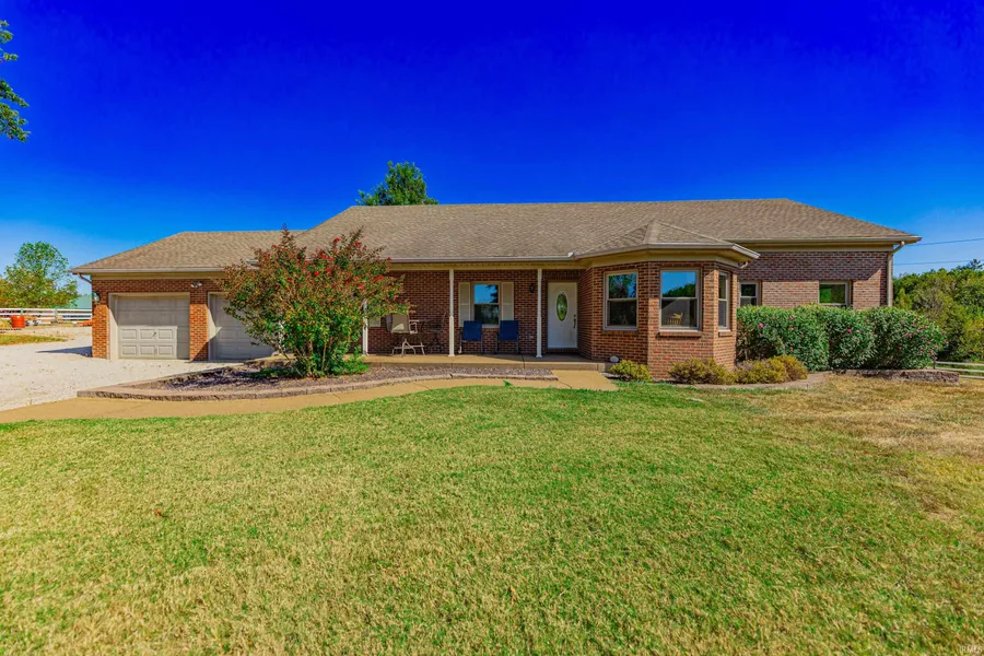 Set on 9 acres, this unique horse property offers the perfect combination of open space, modern amenities, and comfort for both people and horses. The 2,620 sq. ft. home includes 3 bedrooms and 2 full bathrooms with high-quality updates throughout. The kitchen provides abundant counter and cabinet space, granite countertops along with a cathedral-ceiling breakfast nook. Just off the kitchen is an oversized laundry room with storage closet, cabinetry, and room for an additional fridge and freezer. With 12-foot ceilings and hickory hardwood floors in every room, the home feels both spacious and inviting. The great room features a brick fireplace and connects easily to the formal dining room. The large primary suite includes a remodeled bathroom with double vanity, tiled walk-in shower with full body jets, and a walk-in closet. In addition, the primary bedroom has it's own HVAC system for perfect comfort while you sleep. Two additional bedrooms are good-sized with convenient access to the updated hall bath. At the back of the home, a sunroom with a wall of windows and doors overlooks the 18x30 saltwater pool and acreage beyond. The pool area includes a heater and chiller, new pool cover, pergola, Arctic Spa 8 person hot tub and outdoor wood-burning fireplace. Equestrian features include a 75x98 insulated and heated barn with workshop and storage, large stalls with ag-lime mats and auto waterers, plus an outdoor riding arena with its own auto waterer. The acreage is fenced and cross-fenced with trails for both horses and four-wheelers. Additional benefits include: whole house generator and REO electricity service for low utility costs.