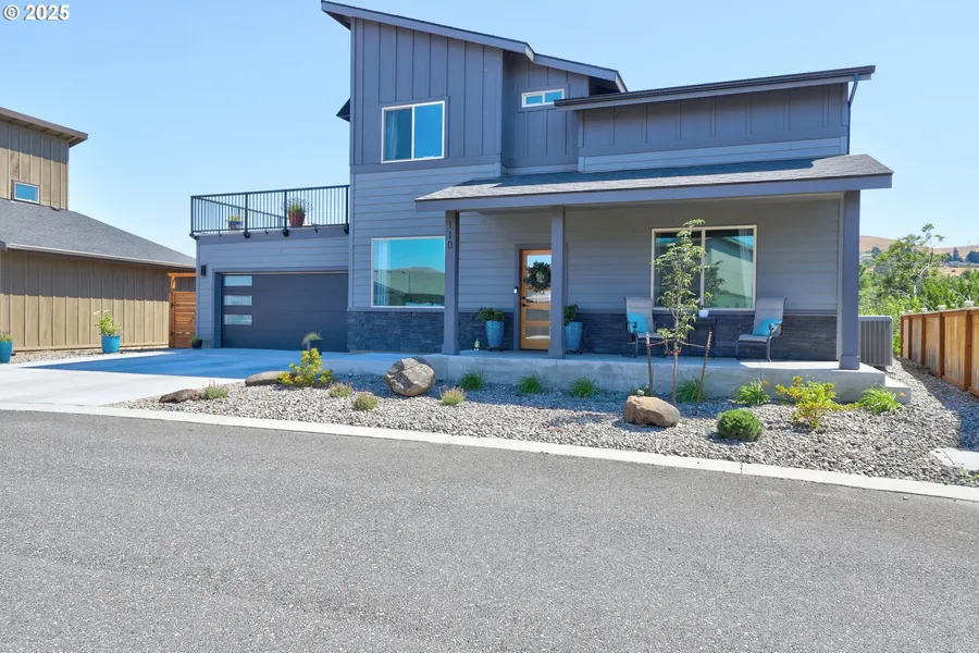 This lovely contemporary home is better than new with updates including landscape enhancements, window coverings and finishing touches throughout. The open concept of the main level is a great space with access to the backyard patio off the kitchen and a hall half bath makes it great for entertaining. The kitchen has a well planned layout with a pantry, dining area and floating island. The stainless steel appliance and solid surface counters add to the beauty of this home. From the kitchen the sliding door takes you to a backyard patio oasis with beautiful patio overlooking the cove filled with water fowl and wildlife. Certain times of the year you may see many eagles near the cove. Occasionally swooping down towards a fish on the water. This patio has room for a bar-be-que and comfy furniture for outdoor entertaining as well as access to the fenced side yard. The primary bedroom suite is on the main level, the ensuite includes a lovely tile shower, double sink vanity and walk in closet. Upstairs is another living space with access to the 22 x 24 roof top deck that offers some great views above the neighborhood overlooking the cove. Also find a full guest bathroom, the laundry closet and two more bedrooms on this upper level. Lone Pine Village is a planned community with modest HOA fees (quarterly $245) and a nice community park with a fantastic water feature.