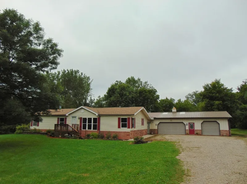 5 acre site with a double wide manufactured home * Wood fireplace and forced air (LP) * 3 seasons room is 15 x 23 * Heated (28 x 57) garage * Cement Storm Shelter * 28 x 60 Pole barn w/concrete * Good septic and well * Also 75 acres (RIM) of hunting land * Sellers prefer to sell both parcels together, but will split if there is a purchase agreement on both