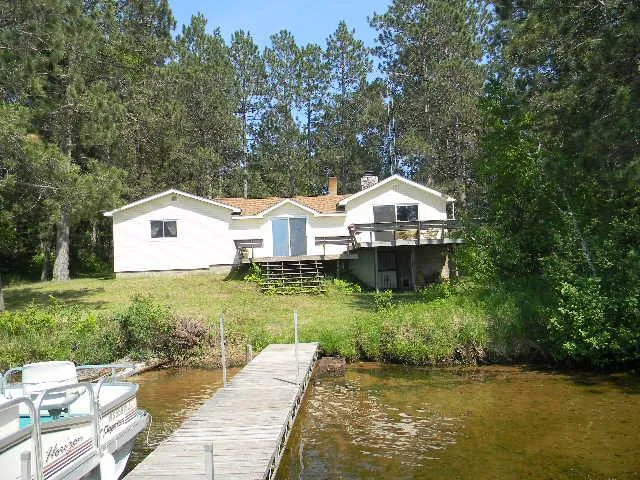 . Two 4 season recreational cabins viewing sunsets from 448' prime shoreline w/4.8 wooded acres, plus Trout spring pond. 2 garages. Tall pines. Main cabin right on the sand bottom shore. 2nd cabin overlooks pond & lake.
