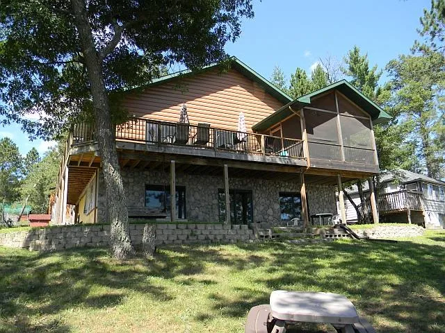 BIG BASS LAKE. Pure sand for this beach. Southerly exposure and easy elevation. There is even a screen porch where you can sit and watch all the fun. This cabin has room for the largest group. Wide open area with the massive stone fireplace as the focal point on one side and the windows to the lake on the other side. Dining area and kitchen with snack barno need for the cook to miss out on the fun. 2 oversized bedrooms to sleep the whole gang. Full bath with laundry facilities to keep you clean. Wrap around deck and porch. Full walk-out basement to finish in your own style. Garage with expansion room above. So bring your family, bring your friends, and have a great time.