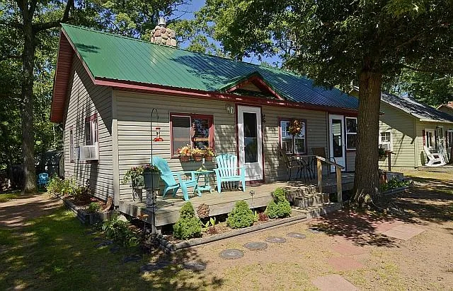 BIG MCKENZIE LAKE. Burnett County. Charming 3-season condo cabin on owned 50 ft sandy beach and shoreline on this popular full recreational lake. Enjoy fishing (yes, walleye and muskie), boating, sailing, and skiing. Level elevation to lake and dock, no steps. 2-BR, 1-BA, 780 sq. ft. move-in condition. Selective updating retained the pretty T & G pine walls and up north feel inside but new is flooring, bathroom, on demand water heater, vinyl siding, metal roof, and attractive Cain LP gas log fireplace. New septic system. Shared well. Many windows facing the lake. Back yard is very private with flower and vegetable gardens, fire pit, and conversation area. McKenzie Landing supper club close by plus boat to bar/grill on the Point. Yearly assoc fees approx $295. Hwy E between cabin and lake.