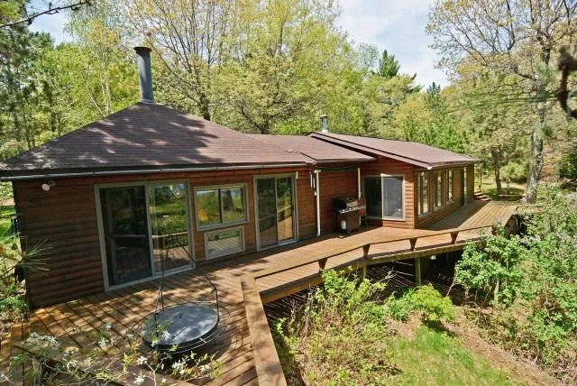 Reduced Price. 872077/46135 CHICOG LAKE. This is something special! 41 nicely wooded & surveyed acres with plenty of walking & driving trails thru. All ending at a level elevation of 400 of serene & private lake + creek shore (open water all year) at the N.W. corner of this interesting lake. Let the enjoyment continue with an array of log style structures starting with a spacious & welcoming 4 season lake facing main cabin with spacious owners suite, I story great room & a kitchen in the roundMove out from here to the wide deck of the single room 24x24 studio, suitable for writer, sculpter or other artisan/crafter to follow their muse. Attached 24x24 garage to boot. To the South, find a 1.5 story 4 season 5 bedroom cabin & matching garage on a slight hill overlooking both creek & lake Now, head North past the sauna to the guest cabin/bunk house w/screen porch. Up the hill to another storage garage & the 60 observation tower. And we have not yet even touched on the design & dcor of all, including the main cabin which ranges from practical to whimsical. If you feel you are on to something here, then you do need to investigate further & arrange for a personal showing of this singular combination of recreational opportunities & natural beauty.