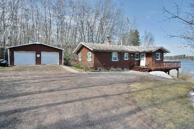 899543/51042 Log look 4 season w/210 nicely sloped shore. 4 Br, 2 Ba, 2 Fireplaces & plenty of lakeview windows. Large garage. 2.7 acres. Addl lakeshore available.