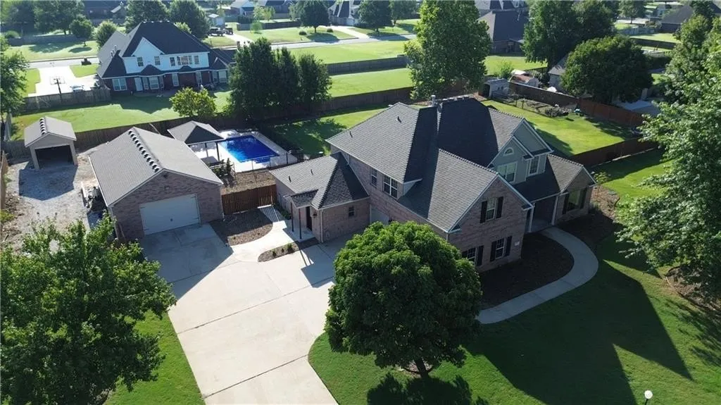 Set on a full acre, this beautiful home is designed for both everyday living and entertaining. The main level features a spacious primary suite, dedicated office, and a newly added 276 sq. ft. utility room with dog bath and extra half bath. The kitchen boasts newer appliances including double oven, microwave, and gas cooktop. Upstairs includes a private media room and additional bedrooms. Outside, enjoy a backyard retreat with a brand-new pool liner, cool decking, and fresh professional landscaping. Additional features include an attached 3-car garage, 40x25 insulated shop, 24x12 storage shed, in-ground storm shelter, new roof in 2021 with transferable 20-year warranty from Brown Boys Roofing, plus 2nd level HVAC in 2017. A rare blend of comfort, function, and outdoor living—move-in ready and easy to show!