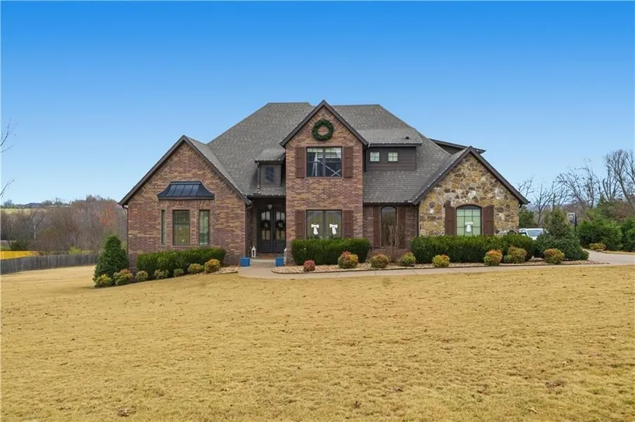 Charming home on 1.59 acres in picturesque Sassafras Wine Country! Perfectly positioned between Fayetteville and Springdale, this home offers an upscale yet relaxed lifestyle where country living meets everyday convenience. You are welcomed into the home with rich hardwood floors, lofty ceilings, and large, bright, open living spaces. The eat-in chef's kitchen features a large marble island & countertops, shiplap ceiling, two pantries, and plenty of room for gathering. Formal dining & living rooms, office, laundry, and primary suite are located on main level. Upstairs you'll find a second primary suite, second laundry, two additional bedrooms, and large bonus room, wired for sound w/ wet bar. Step outdoors onto your east-facing covered deck that overlooks an evergreen-lined patio and park-like backyard. Enjoy peaceful surroundings and good neighbors just minutes from the hustle and bustl...