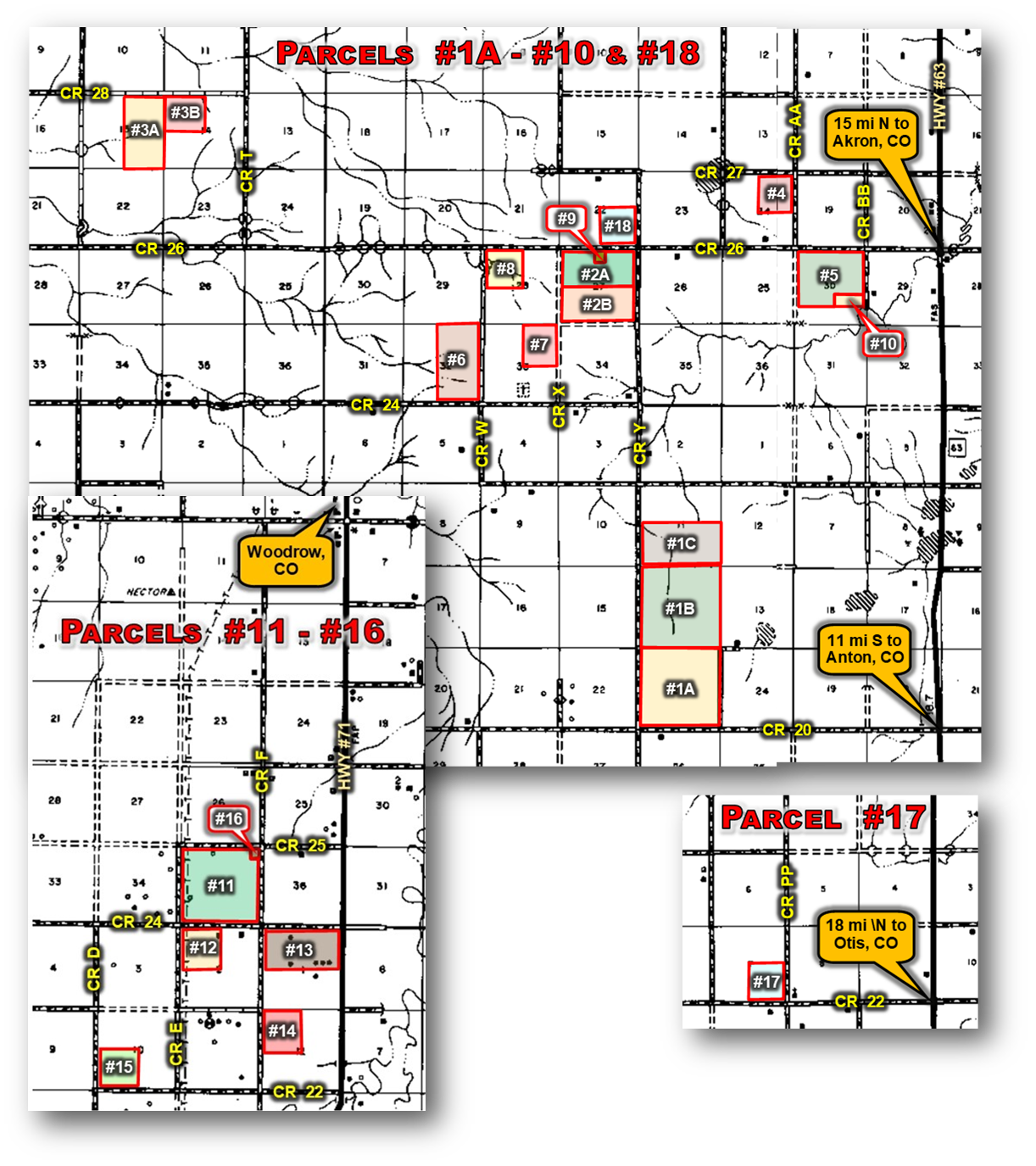 Research Parcel InformationThe parcels within the East Unit consist of 4,042.8 ac and is located 16-29 mi SW of Akron, CO in central Washington, Cty. The parcels within the West Unit consist of 1,438 ac and is located 5-10 mi S of Woodrow, CO in west central Washington, Cty. In addition, 160 ac of CRP located 20 mi SW of Otis, CO, 160 ac of dryland owned by a landlord located directly north of the headquarters