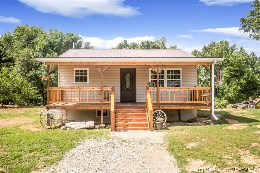 Country living at its finest! This newly constructed adorable home is sitting on 5 acres of beautiful land just outside of Henryville in the small town of New Pekin. The home was built from ground up starting with the structure in 2018 and finishing touches as recently as June 2022! The open living space with natural woodwork and soft gray touches give you a warm feeling as you enter. Everything in the home is NEW! It has been built with 2x6 walls, beautiful covered front and back porches; which could be made into a three season room! The basement has 2 bedrooms that have no egress (windows are 26x17) a full bath and laundry area with a bonus/ family room. Walkout to the secluded backyard all ready for you to use your imagination! There is a New septic, A Garage with a lean-to, garden areas, fruit trees, a barn ready for livestock, a separate water and electric hook up area where a single wide used to be. This property has so many possibilities; Airbnb for horse enthusiasts; or a boarding stable for anyone who may be looking to board a horse(s). This property is surrounded by miles of riding trails in the Forestry! So many options for growth and is ready for a new ownership! Sq ft & rm sz approx.