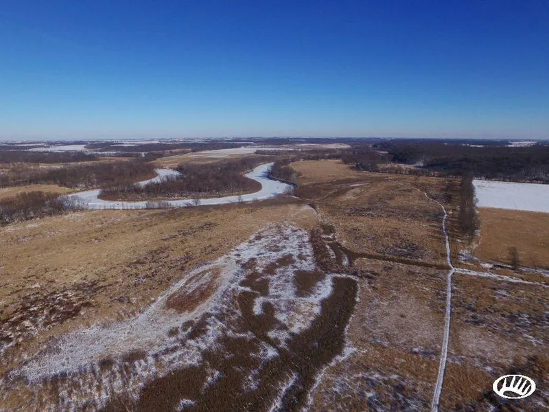 This stretch of native grasses, willow thickets, and timber pockets sits in the infamous Skunk River bottoms between Rubio, Brighton, and Lake Darling. 276 acres are enrolled in the Wetland Reserve Program (WRP), but three acres of higher ground not in WRP allows you to build a house or cabin. That’s huge, giving you the option to stay on premises unlike many other WRP tracts that don’t give you that option. Directly touching to the east is a massive network of hardwood ridges that connect to Brinton Timbers Park, a large no-hunting sanctuary. I sold a property just three miles down river, and big deer are no stranger to the area. Waterfowl, pheasants, and quail are also abundant in this wildlife haven. During the rut, this bottom habitat is the main highway for cruising bucks as they snake the river for a hot doe. This place is littered with rubs, so don’t let the aerial fool you with w...
