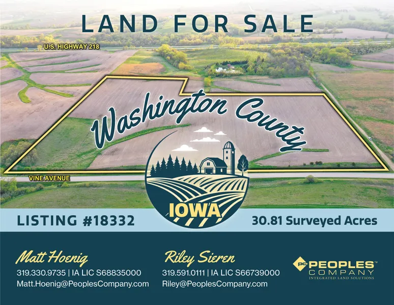 Peoples Company is proud to present a rare opportunity to own and invest in 30.81 acres m/l of highly productive farmland nestled in the heart of Washington County, Iowa. Situated just 6.5 miles south of Riverside and a short 20-minute drive to downtown Iowa City, this property offers both the tranquility of the countryside and convenient access to Interstate 218 and urban amenities.
