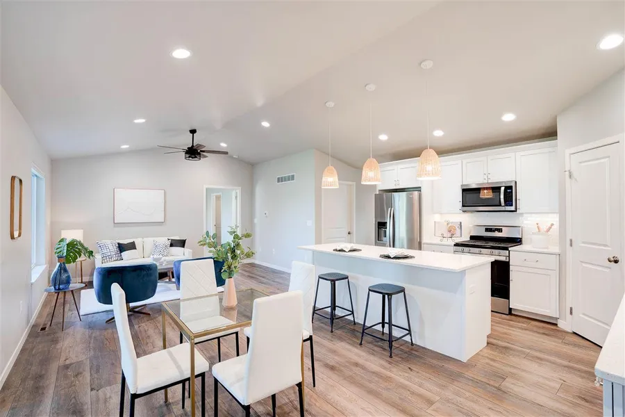 Stylish 4 bedroom, 3 bath, zero entry ranch built in 2021 by MAS Construction. Spacious and open floor plan with vaulted ceilings lets in lots of natural light. Gorgeous kitchen with sparkling quartz countertops, great walk-in pantry and large island with seating, storage and prep space. Admire the beautiful sunsets from the sunroom that walks out to a maintenance free deck overlooking the large backyard. The spacious master suite boasts a walk-in closet and private master bath with walk-in shower. Also on the main floor are a second bedroom, full bathroom with tub, and laundry room with matching Electrolux front load washer and dryer. On the lower level you will find a bright family room, two more bedrooms, a full bath with shower, utility room and large storage room. Extra deep 2 car garage has plenty of room to add shelving. Located in new Valley View development not far from the vibr...