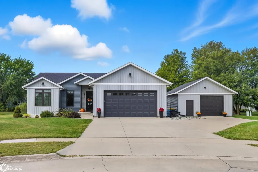 Situated on a quiet cul-de-sac on the north end of town, this 3-bedroom, 2-bath newer home offers a warm and inviting open floor plan the moment you step inside. The great room features soaring ceilings that create a bright and airy feel. At the same time, the spacious kitchen includes a raised breakfast bar, ample cabinet storage with stylish pipe shelving, butcher block style countertops, sleek appliances, and a gas range. The main level features three bedrooms, including the primary suite, which boasts a tile walk-in shower, a walk-in closet, and private access to the back patio. The unfinished lower level provides excellent potential for additional living space, already featuring a non-conforming 4th bedroom area with room to expand into a family room, bedroom, and bath. Outdoors, enjoy a large backyard complete with a deck and pergola, a firepit area, and plenty of room to play. In addition to the attached 2-car garage, the property features a heated detached 2-car garage/shop equipped with a mini-split system for cooling, which the seller is leaving behind—perfect for hobbies or extra storage. The garden shed is reserved and will not be staying with the property. Recent updates: A new screen door has been installed between the garage and the house, a new blind has been added to the sliding glass door in the primary bedroom, and a humidifier has been installed in the HVAC system.