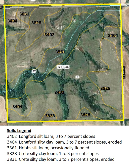 The soils on the cropland are nearly all gently sloping Crete soils. The soils on the pasture are Crete and Longford soils.