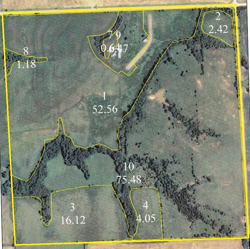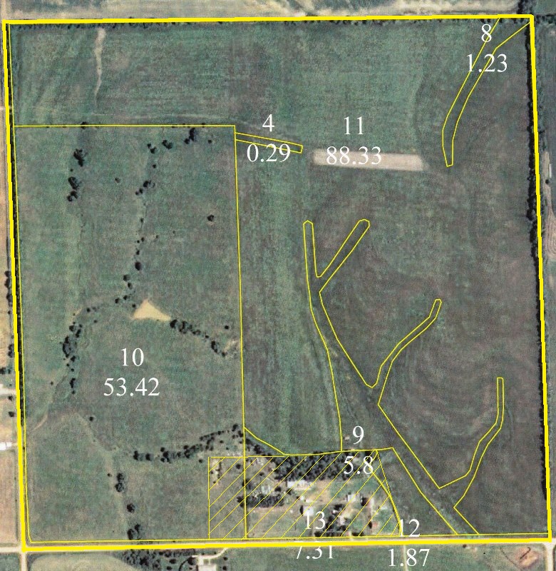This farm consists of approximately 89 acres cropland, 7 acres waterways and 53 acres native grass pasture. There is a pond....