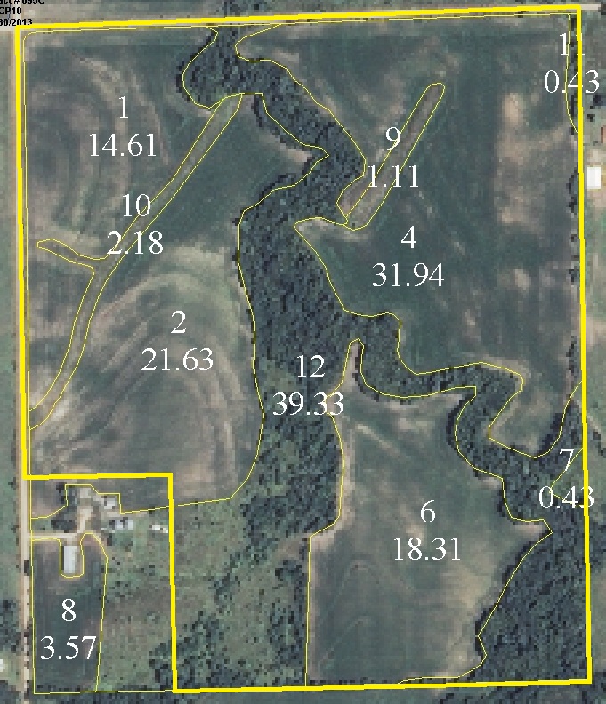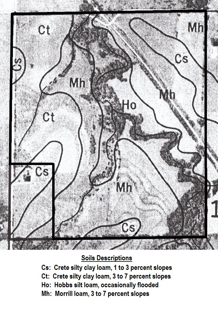 This farm, 124 acres, more or less, consists of approximately 86 acres cropland with the balance of the farm being waterways, creek, timbered draws, and native grassland. The cropland soils are gently sloping and moderately sloping Crete silty clay loam, Morrill loam, and Hobbs silt loam creek bottom. Good terraces and waterways have been in place for many years. The cropland has been well farmed and cared for. The waterways, draws, and grassland provide for excellent wildlife habitat and winter cover for livestock.
