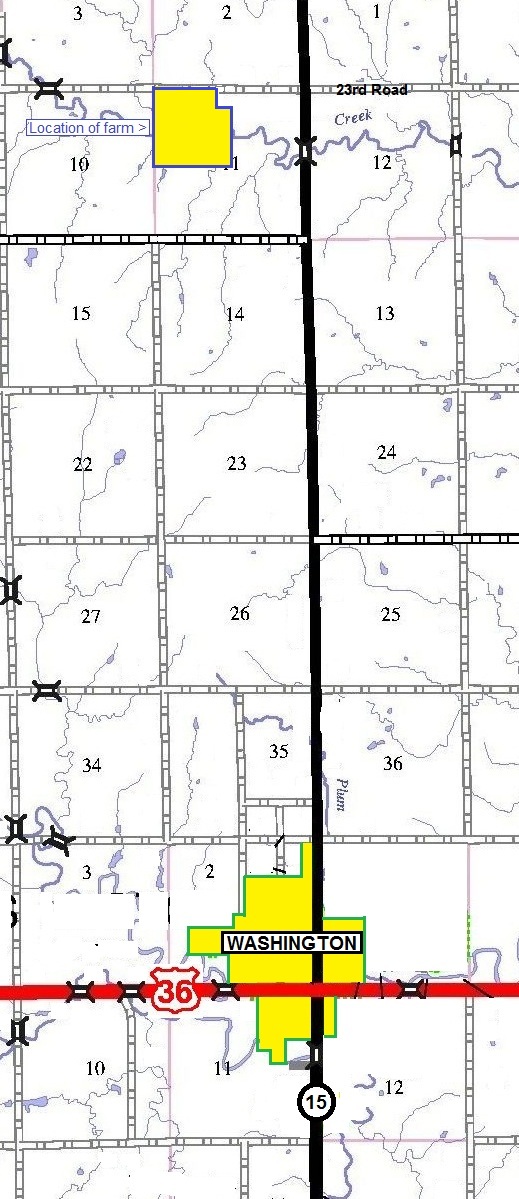 The farm is located 6 miles north of the K-15/US36 junction in Washington to 23rd Road, then 1 mile west. This is the northwest corner of the farm.
