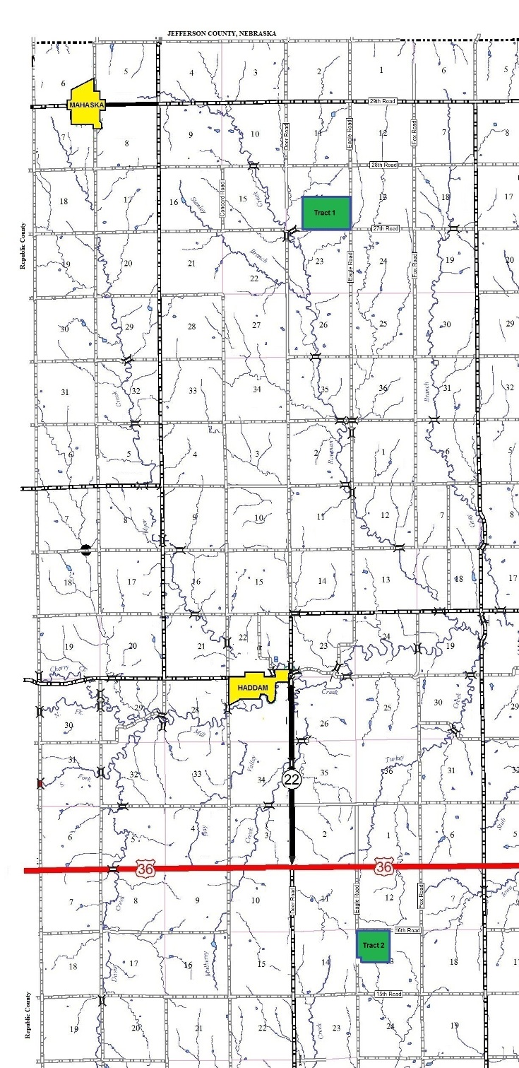 KWP will retain an easement from the west gate on the south road to access the NW SW . The southeast corner of the farm is at the intersection of 27th Road and Eagle Road, four miles east and two miles south of Mahaska, Kansas.