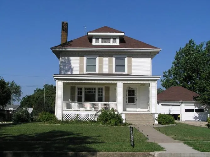 This is a gorgeous and stately American Foursquare style home. It is a two story home built in 1908 with over 2,000 sq. ft. of living space. As you enter the house from the large front porch, you enter into the beautiful foyer which has wonderful hardwood floors and an open staircase. The living room features new carpet, custom blinds and window treatments, a gas fireplace, and built in book cases with leaded glass doors. The living room opens to the large dining area with wood floors. The newly remodeled kitchen with the butler’s pantry is a great updated space. New cabinets, tile laminate floors, new appliances, and the wrap around breakfast bar are all great features to be enjoyed by the new owners. The butler’s pantry adds extra storage to this great kitchen. Right off the kitchen is a sun porch/mud room.