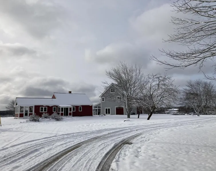 The perfect marriage of old and new, the old is a darling 1850's cape tastefully and meticulously restored with attention to detail and the new, a 3-story, 4,000 square foot contemporary timber frame barn. A magnificent property, on 16 acres with 700 feet of water frontage, has a sweeping view across a field to the shore with expansive southerly views down the bay. From the contemporary, there are views across fields, to the harbor, the village, and open ocean. The cape is the perfect guest house w/4 bedrooms, one en suite, a charming living room with original, wood burning fireplace, 2 full baths and a great kitchen opening onto a screened porch. The barn house, with exposed timbers open to the peak from the second floor great room, kitchen and dining, plus a 3-season sun room, also has 2 bedrooms, a large sleeping loft with a ship's ladder to a tower room with built-in seats for viewin...