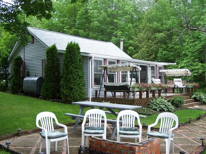 #1223) 8 Aspen Drive, Alexander: Year Round Livable Cottage on Pleasant Lake w/ 2BDR/1B, Sun Porch and Unfinished Loft. A 2 Story 2 Car Garage w/ Seasonal Apartment Overhead w/ 2BDR/1B. Cottage is just 20 ft. from Waters Edge and has 100 ft. of Shore Frontage! A Great Family Retreat!