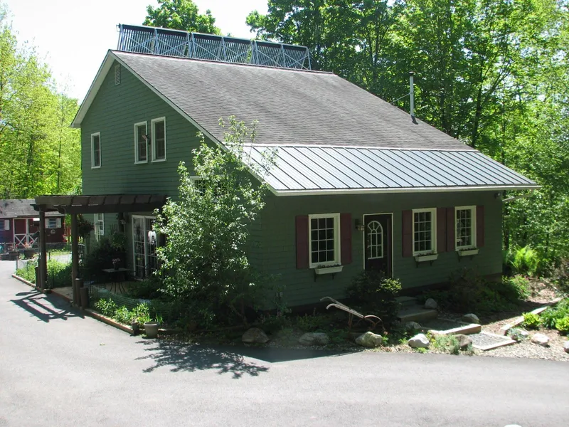 Super efficient Saltbox on 8+ private acres with an adorable, private guest cottage tucked away in the trees. This eco-friendly home includes 2 bedrooms, 2 baths, radiant heat fueled by either solar or LP, a gravity pellet stove, central air & generator. Sliders on both the east & west side of the house lead to a zen-like patio & deck. Theres a small barn and 2 car garage with a workshop addition. Beautiful perennial gardens and plantings.