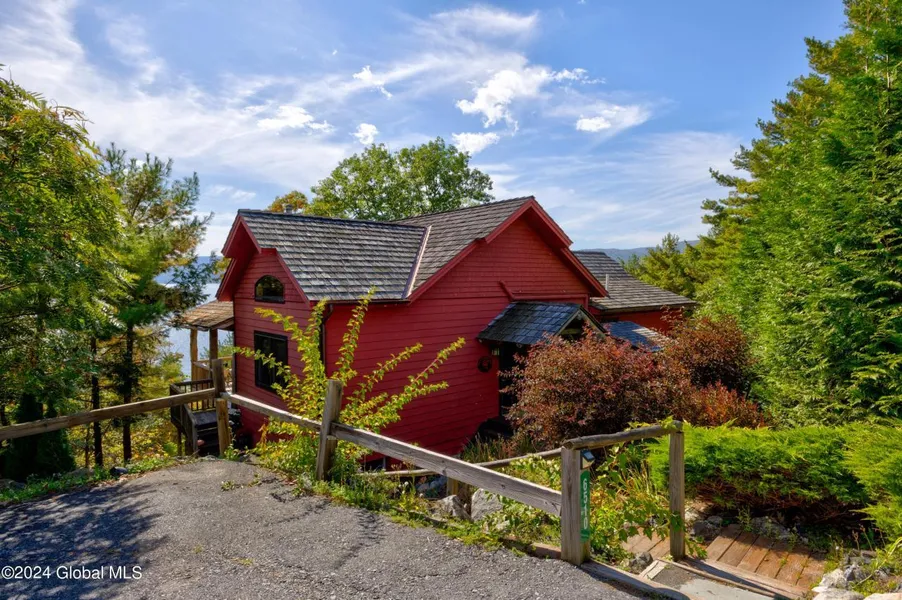 Lake George custom home 75 feet from the lakes edge! Lake life living at its best. Immerse yourself in the breathtaking beauty of Lake George with this stunning spacious 3-bedroom custom built home just steps from the waters of Lake George & adjoining building lot for space & privacy. This meticulously crafted home offers the ultimate lake living experience, directly across from Hague, breathtaking lake views. Hardie plank siding w charming wood grain provides timeless beauty & low-maintenance upkeep, Cedar shake shingles sourced from British Columbia add rustic elegance & character to exterior. Radiant heat flooring provides year-round coziness. On demand generator, minisplit a/c Custom-designed kitchen. Lake views from every window! Sundeck, 25' dock w hydraulic lift, ad'l slip w lot. 'That Red House' is a custom built, lakeside home. The house design is eclectic and unique with both modern and Adirondack decor. The Great room is open and airy with a cathedral ceiling, surrounded by numerous windows with an unobstructed view of Black Mountain to the south. Teak wood and tile floors run throughout the house. The .32 ad'l adjoining lot included in the combo price gives you ad'l space to grow and an a'dl boat slip! The gourmet kitchen, fully stocked with a wide variety of cooking implements included with purchase, dishes, and cookware, is adjacent to the Great Room; the cook is never left out of the action! Nearby is a wet bar, dining area and powder room. There is a 15' X 20' deck, accessed from the Great Room and master bedroom, which is perfect for simply relaxing or enjoying a meal with views of beautiful Lake George just 75' away. As well, there is a covered Adirondack porch, 7' X 16', which offers privacy and a spectacular view of the lake to the south. The Master bedroom/bath is on the main floor which features a large tile shower, washer/dryer and an over sized sliding glass door to the deck. The 2nd and 3rd bedrooms, both with a view of the lake, are located on the lower level along with a triple bunk bed and a second full bath. A french glass door provides access to the lower (covered) sitting area complete with Adirondack chairs, a fire pit, patio and a breathtaking view of the lake. Part of an association which boasts a large, deep water U-shaped dock and well sized sundeck complete with colorful ADK chairs. There is a slip available for each parcel, both for a boat up to 24 feet in length at the association dock. Excellent rental history! Swimming off the deep water dock is a breeze due to two sturdy ladders making it easy to get in and out of beautiful Lake George. Those with small children may wish to visit the town beach. Gull Bay town beach is an easy five minute drive from the house and is located in Gull Bay. It is a clean and quiet sandy beach that slopes gently into the water. Or join the neighboring Association to access the beach just a few feet away. This membership is optional.Home is being offered fully furnished w few personal items excluded. On demand generator also a plus!