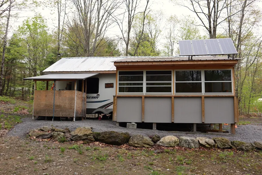 Escape to the outdoors and enjoy this incredible hunting and recreation property featuring a camp, trails, wildlife pond, excellent hunting and complete privacy. The camp consists of a 34-foot fifth-wheel RV, which has been expanded into the perfect getaway camp. The RV sleeps 4 and includes a propane stove, brand new Norcold 8cu’ refrigerator (runs on electric or propane) and an air conditioner. There are two propane heaters which will be included. There is a large 12’ x 16’ outdoor living room which was added just 2 years ago. The outdoor kitchen area features a covered grilling area for those rainy days. The (2) propane tanks (450 gallons each) provide plenty of fuel for cooking and heating. Propane delivery is available to the camp. The RV has been completely enclosed under a metal roof. There is no septic for the camp but there is an outhouse. Several trails meander through the property and are perfect for hiking, snowshoeing or riding ATV’s. The small frog pond in the back corner of the property is shallow but provides water for animals and creates some great bio-diversity. The property is completely wooded and features maple, oak, hickory, beech, cherry and hemlock. Hunters take notice this is a great small acreage hunting property with a history of nice bucks and turkeys in the area. Trail cameras and harvest photos indicate some very nice bucks in recent years. Several rubs were located in various locations around the property. Multiple mature Red Oak and Hickory trees provide mast crop for deer, turkey and other wildlife. The terrain on the property is relatively flat with a few small rolling hills of about 20’ or so in elevation gain/loss. The terrain creates natural funnels which encourage movement. There is a cleared open area next to the camp with plenty of space for parking as well as room for target shooting. Electricity is not available but power for the camp is provided by a combination of solar panels and a generator. Camp A Way Road is a private road not maintained by the town and requires a 4-wheel drive vehicle for access. Just 8.9 miles to Granville and 19 miles to Glens Falls. Contact me today for more information or to schedule your own private showing. Property is sold as is. All showings are by appointment only and potential buyers must present proof of funds or pre-approval for confirmation of appointment. Buyers must have an agent present for showings.