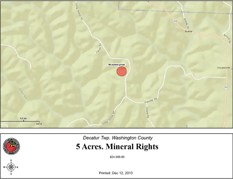5.356 acres of Mineral rights for sale in Section 23, Decatur Twp, Washington County. Oil/gas rights are held by production from existing well and the current royalties are reserved by a previous owner. Any new oil/gas wells will pay the mineral owner 12.5% royalty. Aerials are for reference only. Surface tract is not included in sale. Minerals are agent owned.