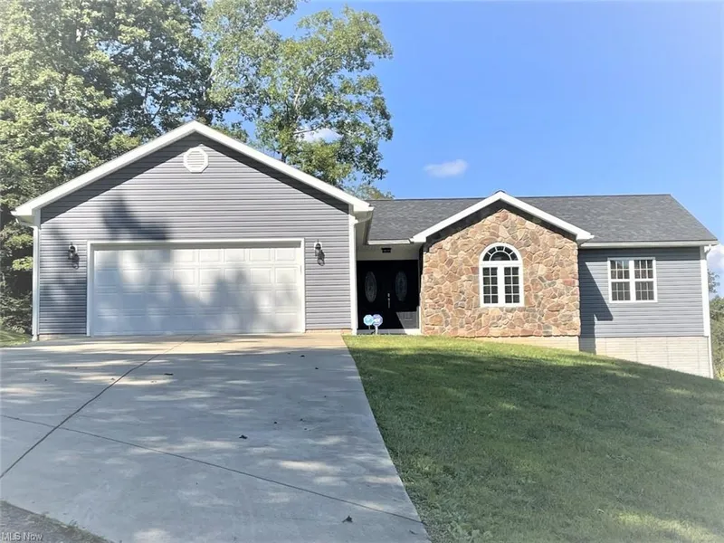 This beautiful stone and vinyl sided ranch was built in 2016. Enter into the home through gorgeous double doors into the living room with a cathedral ceiling, gas fireplace, and French doors leading to a deck. The kitchen has recessed lighting, beautiful cabinets, and a pantry. The dining area, just off the kitchen, has a peninsula for bar stools. There are three carpeted bedrooms with a lot of natural light. The main bath has a walk-in, lighted bathtub and linen closet. The master bathroom has double sinks, jetted tub, and a separate shower. The basement, with its poured foundation and French doors leading outside, is waiting for you to finish. The 24 x 12 outbuilding has electric. This home is back on the market through no fault of home.
