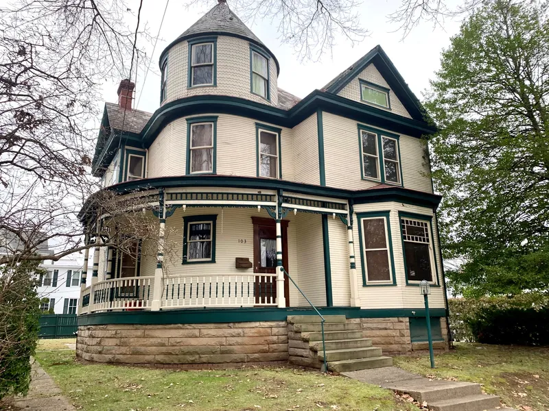 This downtown Victorian treasure is sure to please the most discriminating buyer. The wraparound porch welcomes you to the amazing foyer with its curved staircase, oak beadboard wall, and beautifully restored hardwood flooring. The spacious living room features a stone fireplace and a bay area with a stained glass window. Beautiful original functioning pocket doors lead you to the large family room again with bay window space. The formal dining room features the original refinished oak flooring as well as the living and family rooms. The 10' ceilings with 9' paneled doors refinished along with the oak woodwork and trim is reminiscent of days gone by. The updated kitchen offers cedar shake ceiling accents with recessed lighting and dinette area. There is a convenient bath on the first floor and a rear staircase leading to the second floor. The curved entry stairs leads you to a loft area ...