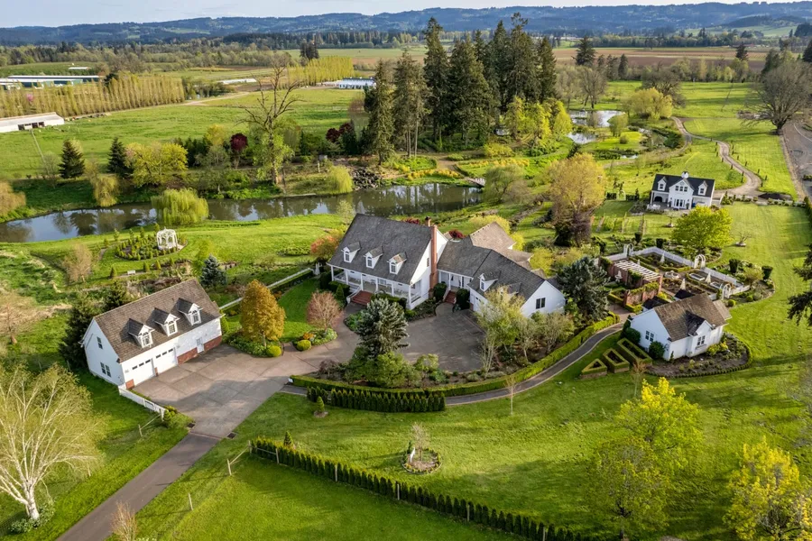 Breathtaking 49+ acre Tualatin riverfront estate in the North Willamette Valley and Wine Country. Follow the birch lined driveway to a lovely family home surrounded by 7 acres of the renowned Oakwood Gardens. The main home is adjacent to a large nature pond with a waterfall and features natural light flooding into the southern facing gourmet kitchen which is open to a family living room with a wood burning fireplace. The principal suite onthe main floor overlooks the gardens and includes a custom glass shower, heated marble floors, a huge soaking tub, and 2 large walk-in closets. Two of the upstairs bedrooms are ensuite and the other 2 bedrooms share a Jack and Jill bathroom. The rest of the home includes a wood lined library/den with fireplace, formal dining room and formal living room plus a huge recreation room for the kids. There is also a studio and retreat over a detached garage. T...