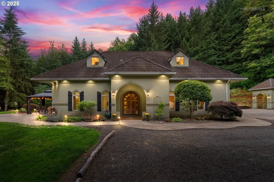 Welcome to 40811 NW Linklater Rd, North Plains, OR - a private Tuscan-inspired retreat set on two forested parcels with Whiskey Creek and Trickle Creek winding through. Enjoy groomed trails for walking, riding, or quads, with room to expand. A timber deferral offers potential marketable timber (buyer to verify). Outdoor amenities include an above-ground pool, full-yard irrigation, a large garden with irrigation, stunning paver patio with firepit, and a covered RV pad with its own patio. In addition, this property offers direct creek access with a designated picnic and camping area, perfect for relaxing or overnight stays immersed in nature. The 5-bed, 4-bath home features radiant and in-floor heating, a high-producing well, septic, and main-level living with two primary suites. Upstairs offers two bedrooms, a shared bath with tiled walk-in shower, and a spacious common area. A detached 3...