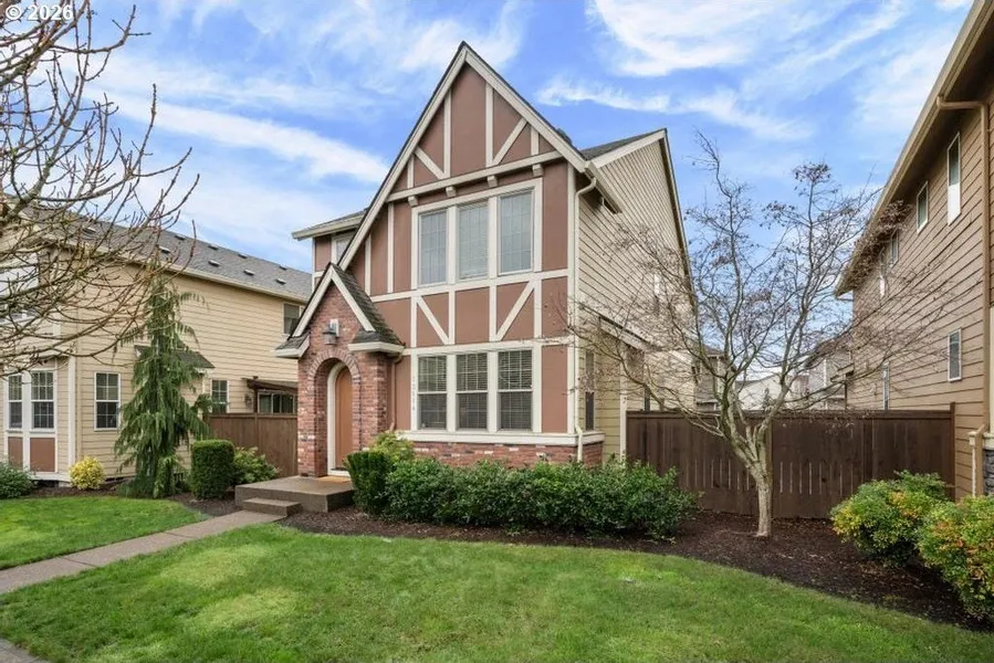 Charming two-level home in the Edgewater on the Tualatin community, steps away from Deer Creek Elementary and conveniently located near parks, walking paths, shopping, and dining. Classic brick accents and Tudor-style trim create adorable curb appeal. Inside, an open layout provides seamless flow between the kitchen, dining area, and living room. Upstairs offers a versatile flex space, dedicated laundry room, and three bedrooms, including a spacious primary suite with ensuite bath and walk-in closet. The fully fenced side yard with a large deck is perfect for summer dining or entertaining. A two car garage with high ceilings and built-in storage racks adds flexibility and convenience. Low quarterly HOA dues covering front yard maintenance, commons upkeep, and professional management make for easy, low-maintenance living. Move-in ready and waiting for its next chapter.
