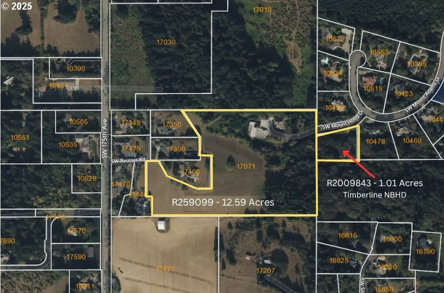 Prime 13.62-acre development property within the Cooper Mountain Urban Growth Boundary. Amazing Mt. Hood view property adjacent to Murrayhill and the prestigious Timberline Estates. Community plan has been adopted! To be zoned Cooper Mountain Residential Mixed (CM-RM) following annexation into the City of Beaverton. The land offers breathtaking Mt. Hood views and includes an stunning 4,222 SQFT home, a regulation-size pool, and a beautiful pool house (ideal for community pool?), with an estimated value of $2 million. Owner amenable to keeping house and pool if developer desires. A dedicated utility easement is in place. Located in the desirable Mountainside High School boundary, the property is also close to Cooper Mountain Nature Park, Winkelman Dog Park, and the shopping, dining, and entertainment options at Progress Ridge and Murrayhill. This location is fabulous with $1.5 million homes close by!